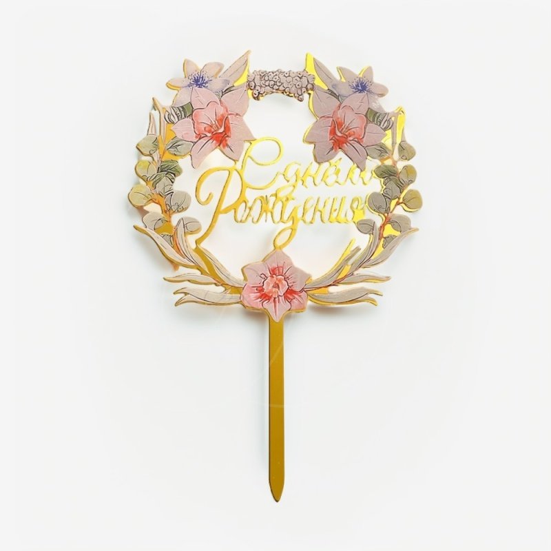 Доставка Топпер декоративный акриловый "С днём рождения. Цветы" Золото 11х17 см из магазина в вашем городе: